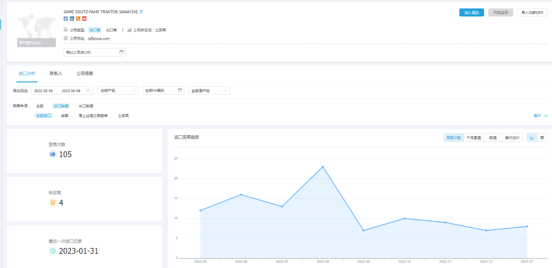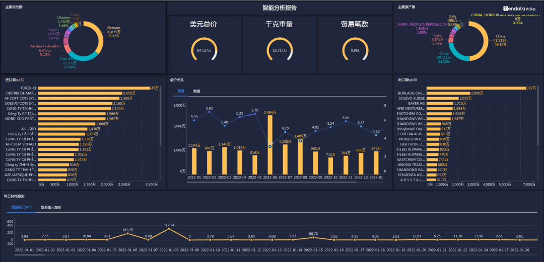 EVO视讯官网外贸通能够一键查询和追踪某类产品的全球交易详情,并体现整个供应链的采购供应,最大程度展示整个贸易网的情况,基于交易数据的统计分析,多维度分析行业、产品市场趋势,助力企业洞察市场变化、把握不同市场采购淡旺季,从而准确定位目标市场。