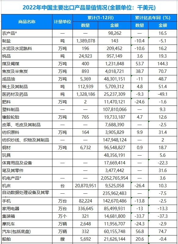 一、2022年中国主要出口产品量值情况